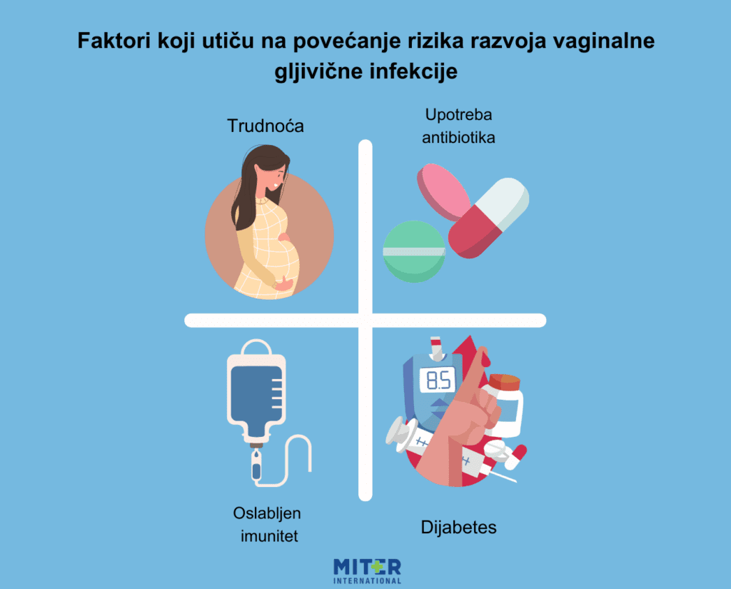 Određeni faktori mogu povećati rizik od dobijanja vaginalne gljivične infekcije. Oni su slični i za vaginalnu kandidijazu kao i za kandidijazu bilo kog drugog dela tela. Neki od faktora za povećanje rizika vaginalne kandidijaze su:Korišćenje antibiotika, kontraceptivnih pilula ili određenih steroida.