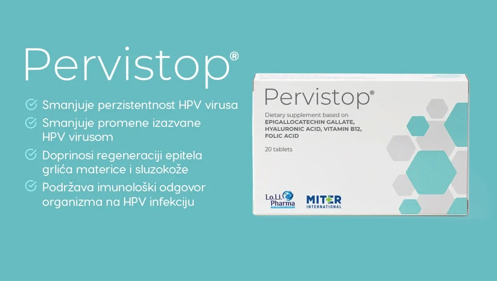 Pervistop® je dodatak ishrani formulisan da pruži trostruku podršku organizmu u borbi protiv HPV-a - imunološku, antioksidativnu i regenerativnu. Namenjen je i ženama i muškarcima sa potvrđenom HPV infekcijom, posebno onima kod kojih virus perzistira ili postoje promene izazvane HPV-om. Pervistop® sadrži kombinaciju aktivnih sastojaka čiji su efekti protiv HPV-a pokazani u kliničkim ispitivanjima: tu su epigalokatehin galat (EGCG) - moćan antioksidans sa antivirusnim i imunomodulatornim dejstvom, koji može inhibirati razmnožavanje HPV-a; zatim hijaluronska kiselina - molekuli niskomolekularne hijaluronske kiseline pomažu zaceljenje oštećenog tkiva i regeneraciju epitela, obnavljajući prirodnu barijeru koja sprečav ponovni prodor virusa; tu su i vitamin B12 i folna kiselina - važni za zdravu deobu ćelija i funkciju imuniteta (zanimljivo je da deficit ovih vitamina korelira sa većim rizikom od perzistencije HPV infekcije).