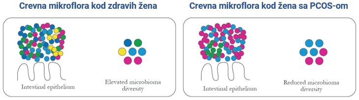 Najnovija istraživanja potvrđuju da osobe sa insulinskom rezistencijom i sindromom policističnih jajnika imaju izmenjen sastav crevne mikroflore (kao što je prikazano na slici), koja je normalno sastavljena od određenog broja različitih mikroorganizama. Takvo stanje otežava resorpciju i smanjuje efikasnost određenih komponenata hrane i lekova, pa tako i inozitola.