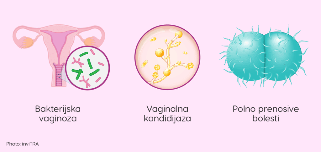 Najčešća gljivična vaginalna infekcija jeste infekcija gljivicom kandida, koja je normalno prisutna u vaginalnoj flori, ali onda kada se razmnoži u prevelikom broju i prodre u epitelne ćelije može izazvati tegobe kao što je svrab, vaginalno peckanje, iritacija, crvenilo i otok spoljašnje intimne regije, te gusti, sirast, beo sekret. Korišćenje kontraceptivnih pilula, hormonske terapije ili antibiotika, ishrana bogata šećerima, hormonske promene usled trudnoće, dijabetes ili oslabljen imunitet mogu imati ulogu u izazivanju genitalne kandidijaze. S druge strane, do bakterijskih infekcija dolazi usled poremećaja normalne bakterijske flore vagine, odnosno povećanja određenih bakterija u vaginalnoj flori (vaginalna disbioza). Laktobacili su dobre bakterije koje štite vaginu i održavaju odgovarajući pH nivo, a kada su u padu, broj patogenih bakterija se poveća, dovodeći do bakterijske vaginoze. Bakterijsku vaginozu možete prepoznati po pojačanom sluzavom i sivo-beličastom sekretu koji je dodatno primetan zbog svog neprijatnog mirisa, koji se intenzivira nakon seksualnog odnosa (neretko se opisuje kao neprijatan miris na ribu). Ne dovodi do crvenila vaginalnih zidova kao što je to slučaj kod kandide, ali i kod bakterijske infekcije je moguće da se javi vaginalno peckanje (posebno u toku mokrenja) i vaginalni svrab.Polno prenosive bakterijske infekcije i virusne infekcije