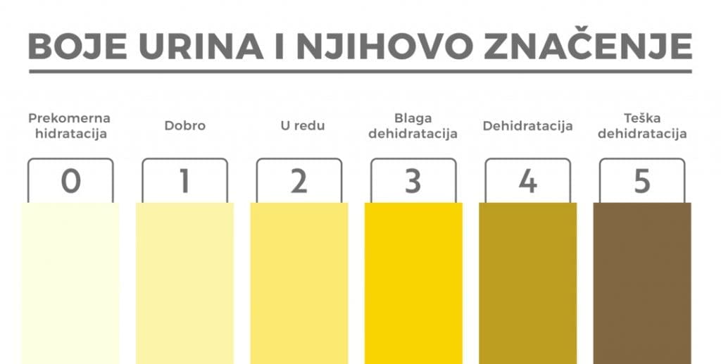 Boja urina može da ukaže na to da ne konzumirate dovoljno veliku količinu tečnosti. Na primer, ukoliko Vam je boja urina previše tamna, ovo može da označava tešku dehidrataciju, a ukoliko je boja providna, ovo može da znači da konzumirate previše tečnosti. U svakom slučaju, obratite pažnju na boju urina, i uporedite sa grafikonom ispod: